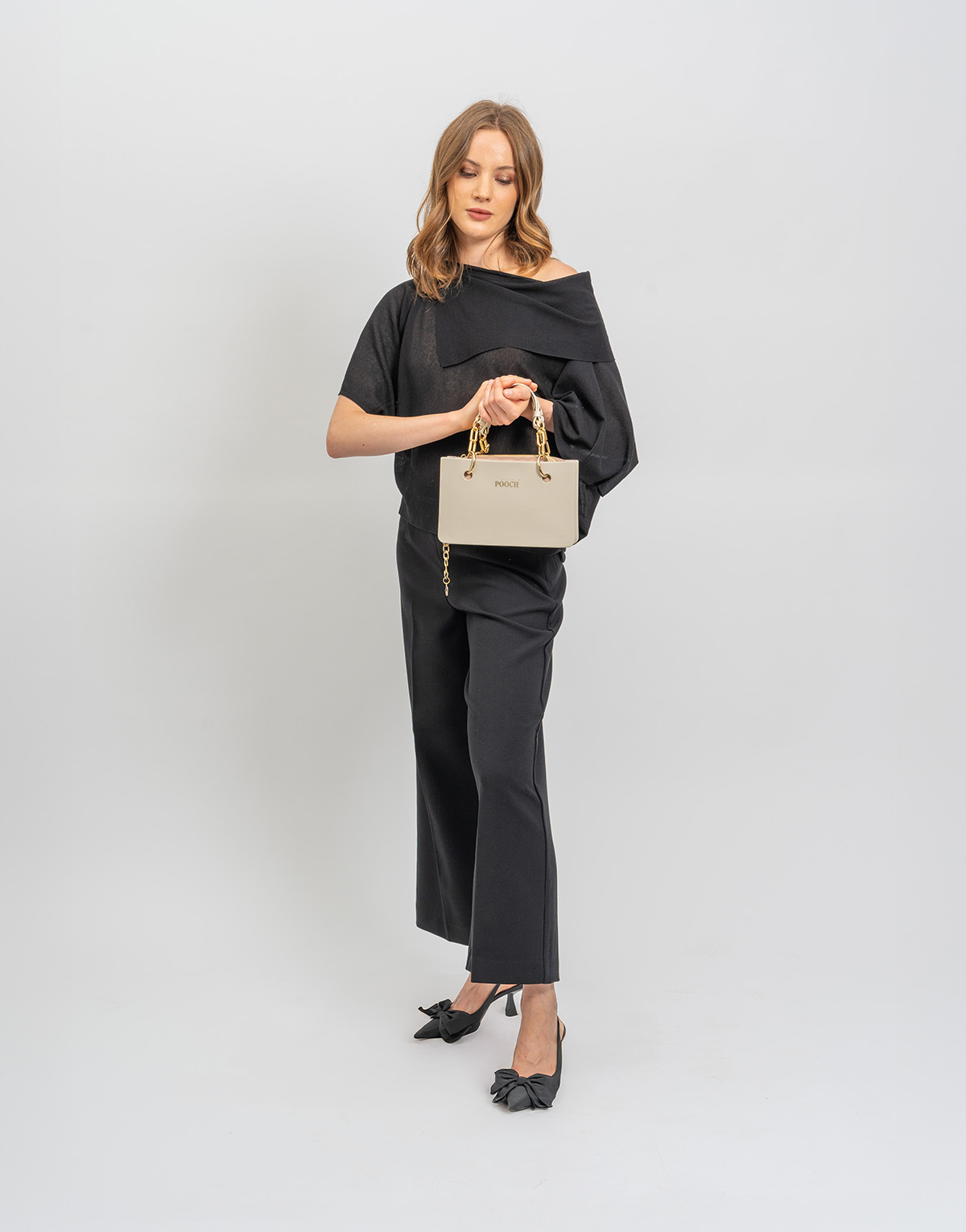 A Box Bag, uma bolsa vegan, sustentável, perfumada e 100% portuguesa, feita em B-Light®, um composto exclusivo de borracha perfumada, na elegante cor cru, com letras douradas pintadas à mão que conferem sofisticação e personalidade. A bolsa inclui um nécessaire em elastano nude, com fecho dourado personalizado com a marca Pooch e divisões no seu interior, e vem acompanhada de duas alças de mão glamour com elos em metal dourado (0,30 m), perfeitas para variar o estilo e o conforto de uso. (A Alça Glamour cru para tiracolo ou ao ombro é OFERTA). A Pooch Box Bag é uma peça compacta, funcional e cheia de charme, criada para mulheres que desejam unir elegância, autenticidade e sofisticação em cada detalhe.