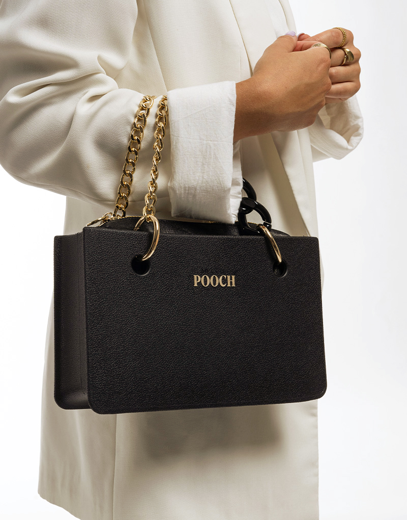 Pooch BoxBag com letras em dourado em B-Light® (um composto de borracha perfumado) cor preta com nécessaire em lux preta e fecho dourado. Inclui duas alças de mão Mix Osso de 30cm.