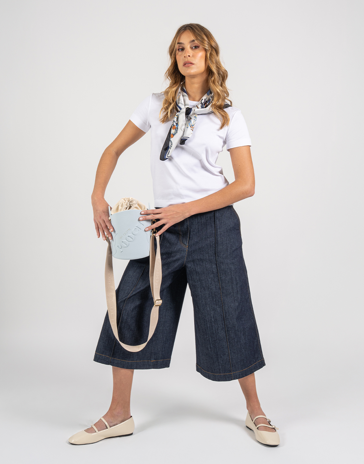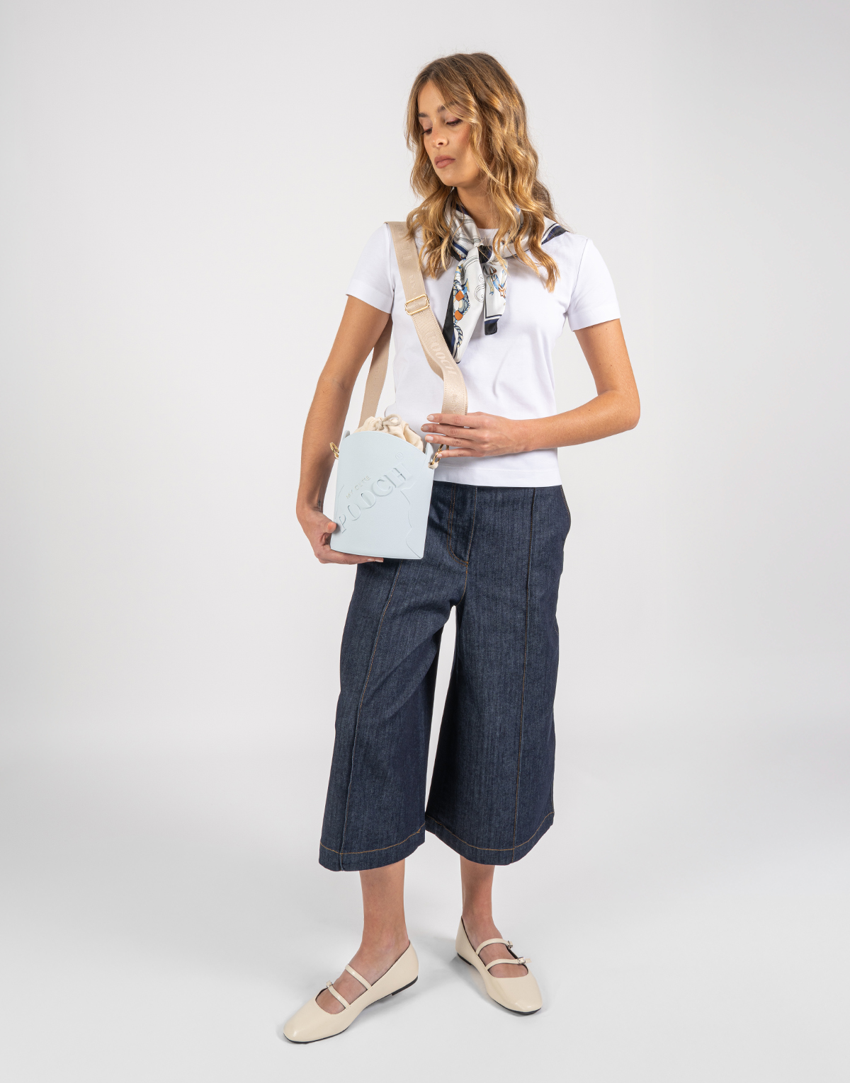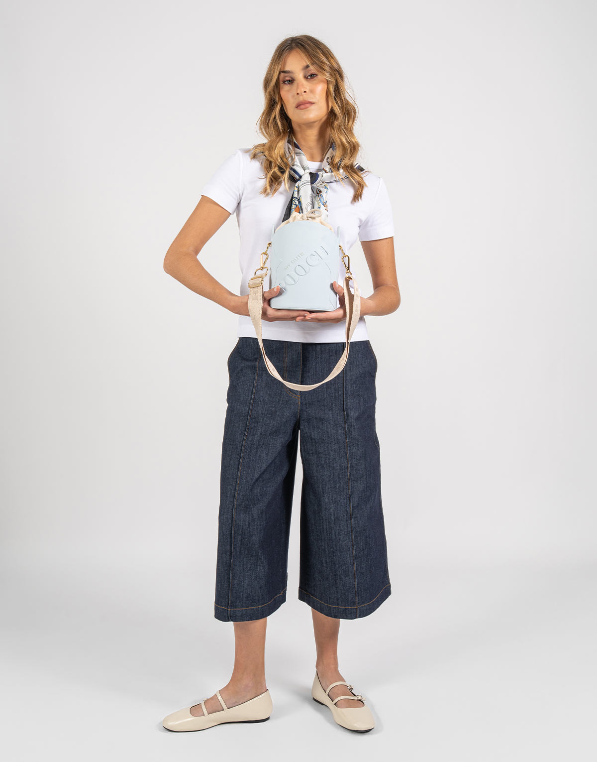 Delicada e simplesmente irresistível. Esta bolsa em azul pastel traz um toque intemporal ao look. O seu design contém as orelhinhas nas laterais e o slogan “Always by your side”. Acompanha necessaire purelona cru, prática e espaçosa, perfeita para organizar seus bens essenciais. A alça Maria cru em jacquard, regulável até 1,40m garante conforto e leveza no uso. Uma bolsa com a funcionalidade na medida certa — ideal para quem ama detalhes neutros e harmonia de cores.