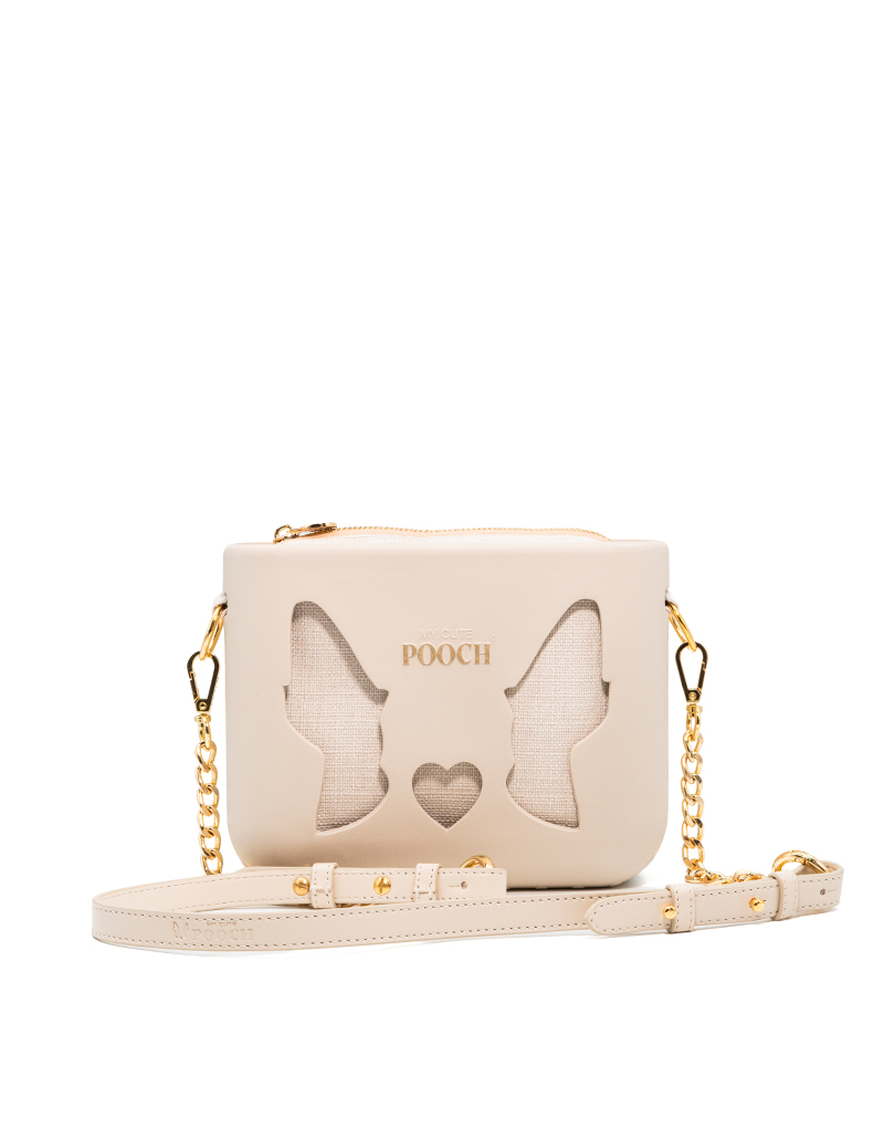 A CUTOUT é mais do que uma bolsa: é uma obra de arte 100% portuguesa, vegan, reciclável e muito duradoura. Personalizável para refletir quem tu és, transmite afeto e originalidade, adapta-se a todos os estilos e ocasiões e torna-se a companheira perfeita para cada momento da tua vida. A Cutout é produzida em B-Light®, um composto nobre e exclusivo de borracha reciclável e ultraleve. Com toque irresistivelmente suave na cor cru e letras pintadas à mão em dourado. No interior do necessaire tem bolsos internos e o exterior é confecionado no tecido linho suave, com fecho dourado personalizado com a marca POOCH. Como assinatura inconfundível da marca tem o formato das orelhinhas e o nariz, uma alça mix com ombreira em pele sintética cru e corrente agnes. A alça é regulável até 1,16 m.