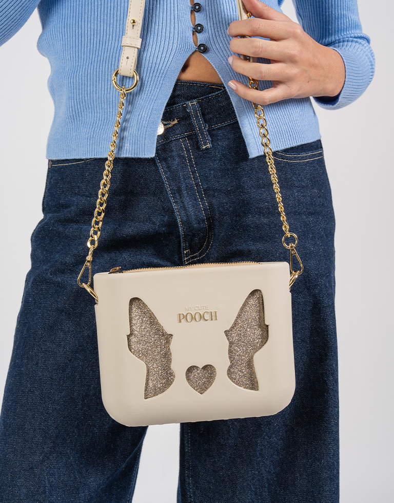 A CUTOUT é mais do que uma bolsa: é uma obra de arte 100% portuguesa, vegan, reciclável e muito duradoura. Personalizável para refletir quem tu és, transmite afeto e originalidade, adapta-se a todos os estilos e ocasiões e torna-se a companheira perfeita para cada momento da tua vida. A Cutout é produzida em B-Light®, um composto nobre e exclusivo de borracha reciclável e ultraleve. Com toque irresistivelmente suave na cor cru e letras pintadas à mão em dourado. No interior do necessaire tem bolsos internos e o exterior é confecionado no tecido glitter dourado , com fecho dourado personalizado com a marca POOCH. Como assinatura inconfundível da marca tem o formato das orelhinhas e o nariz, uma alça mix com ombreira em pele sintética cru e corrente agnes. A alça é regulável até 1,16 m.
