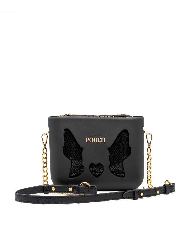 A CUTOUT é mais do que uma bolsa: é uma obra de arte 100% portuguesa, vegan, reciclável e muito duradoura. Personalizável para refletir quem tu és, transmite afeto e originalidade, adapta-se a todos os estilos e ocasiões e torna-se a companheira perfeita para cada momento da tua vida. A Cutout é produzida em B-Light®, um composto nobre e exclusivo de borracha reciclável e ultraleve. Com toque irresistivelmente suave na cor preta e letras pintadas à mão em dourado. No interior do necessaire tem bolsos internos e o exterior é confecionado no tecido Selvagem preto, com fecho dourado personalizado com a marca POOCH. Como assinatura inconfundível da marca tem o formato das orelhinhas e o nariz, uma alça mix com ombreira em pele sintética preta e corrente agnes, regulável até 1,16 m.