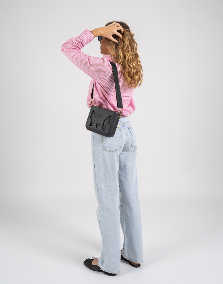 Delicada, charmosa e simplesmente irresistível. Esta bolsa preta traz um toque intemporal ao look. Como assinatura inconfundível da marca tem o formato das orelhinhas e o nariz lúdico e encantador. Acompanhada com necessaire de ráfia preta, é prática e perfeita para organizar seus itens. A alça Maria preta em jacquard, regulável até 1,40 m garante conforto e leveza no uso. Uma peça que combina fofura e funcionalidade na medida certa — ideal para quem ama detalhes neutros e harmonia de cores.