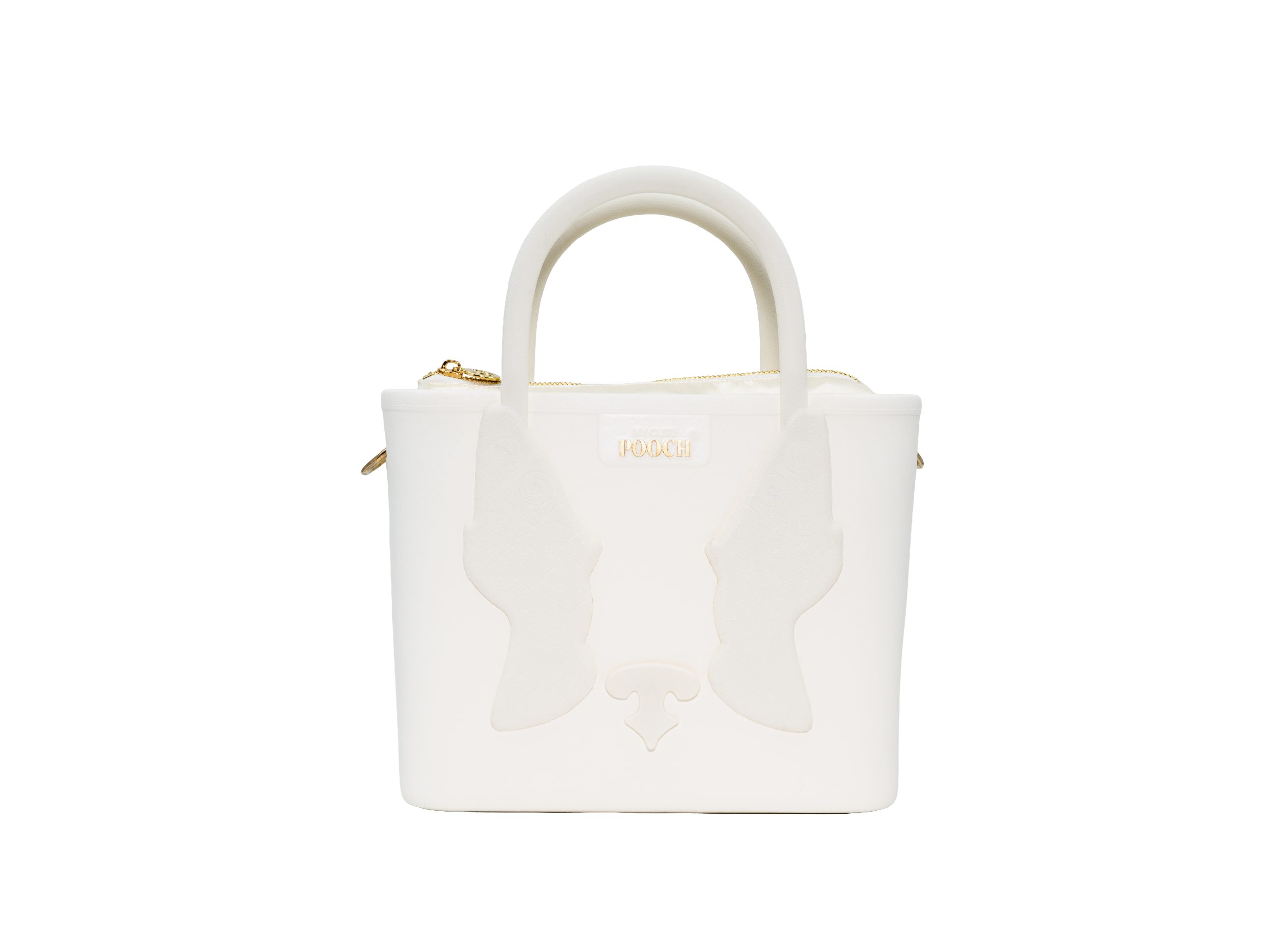 Base lady pooch em B-light branca, 2 orelhas brancas com padrão doggy e alça branca encorpada na orelha (0,30 mts), Necessaire em cetim pérola.