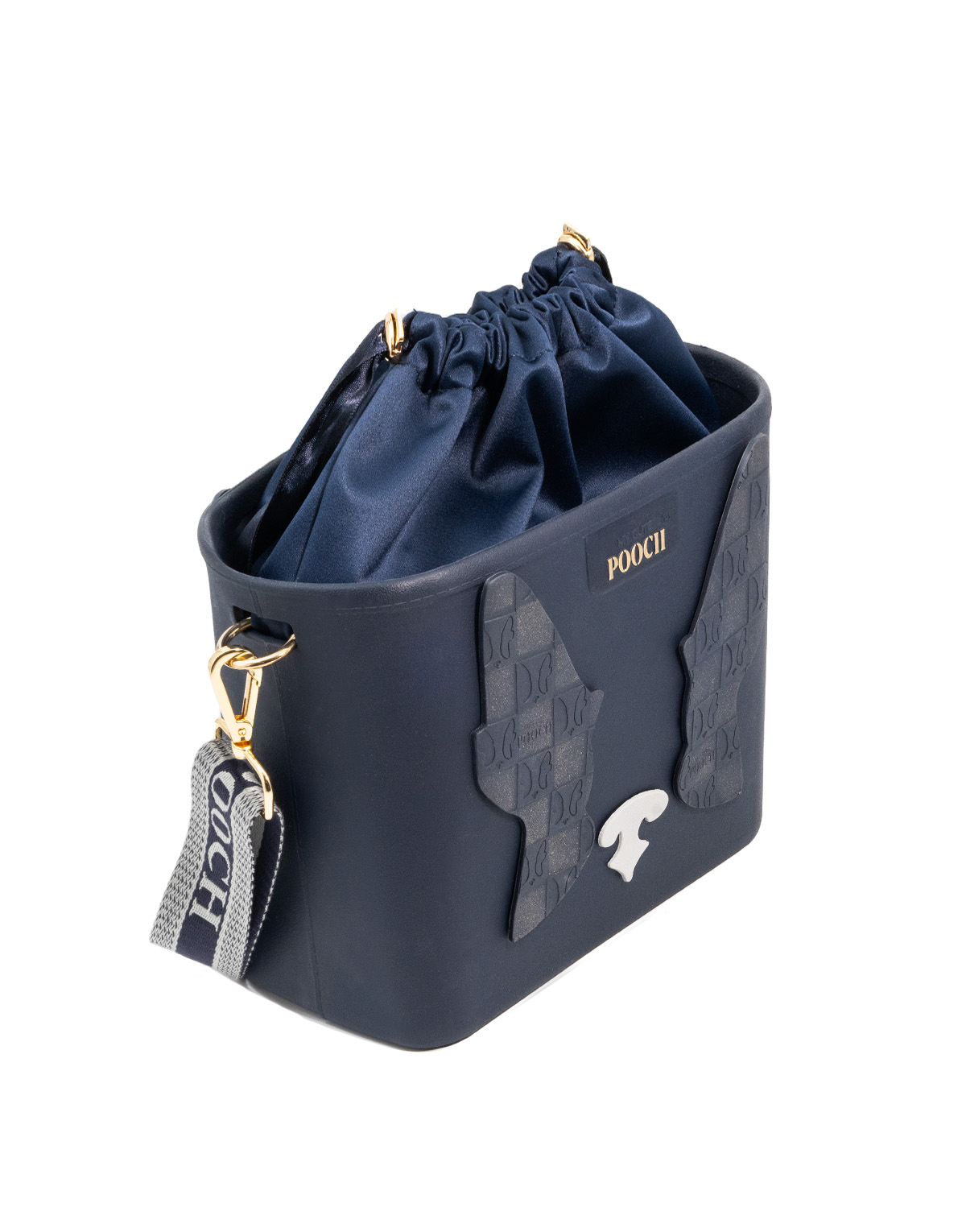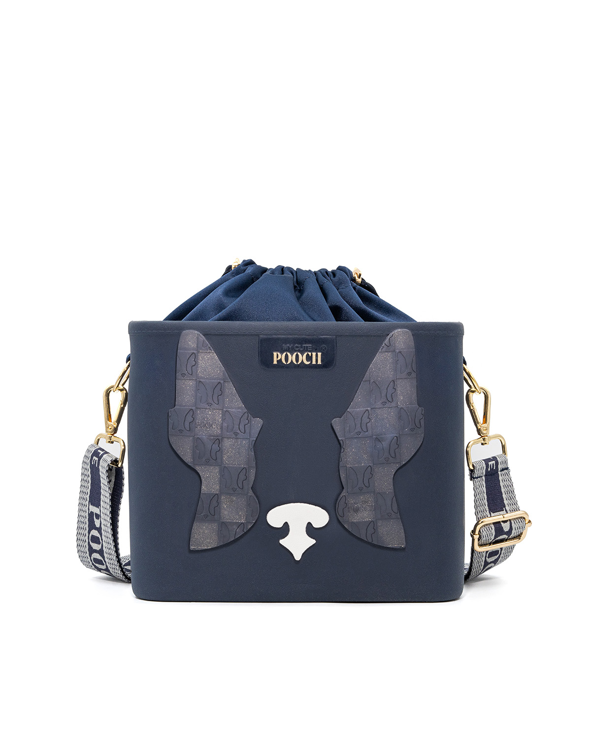 Lady Pooch, uma bolsa vegan, sustentável, perfumada e 100% portuguesa, feita em B-Light®, um composto exclusivo de borracha perfumada, na sofisticada cor azul marinho, com letras douradas pintadas à mão que conferem personalidade e sofisticação.O charme da bolsa é completado pelo nariz cinzento e pelas 4 orelhas Portrait azul-marinho com glitter, harmonizando com a alça em tecido Jacquard azul e cru, ajustável até 140 cm, prática, elegante e confortável. Inclui ainda uma nécessaire em cetim rebuçado azul marinho, no interior tem bolsos perfeitos para organizar pequenos objetos. A Lady Pooch é uma peça personalizável, funcional e cheia de personalidade, ideal para mulheres que valorizam sofisticação, versatilidade e singularidade em cada detalhe.