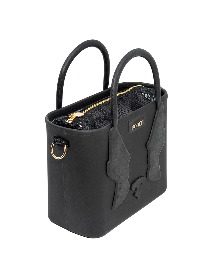 A Lady Pooch é mais do que uma bolsa: é uma obra de arte 100% portuguesa, vegan, reciclável e muito duradoura. Personalizável para refletir quem tu és, transmite afeto e originalidade, adapta-se a todos os estilos e ocasiões e torna-se a companheira perfeita para cada momento da tua vida. A Lady Pooch é produzida em B-Light®, um composto nobre e exclusivo de borracha reciclável e ultraleve. Com toque irresistivelmente suave na cor preta e letras pintadas à mão em dourado. O necessaire tem bolsos internos e o seu exterior é confecionado em tecido selvagem preto, com fecho dourado personalizado com a marca POOCH. Como assinatura inconfundível da marca, a bolsa traz delicadas orelhinhas com alça incluída, decoradas com o slogan da marca Always by your side (contigo sempre a meu lado), um nariz na cor preta.