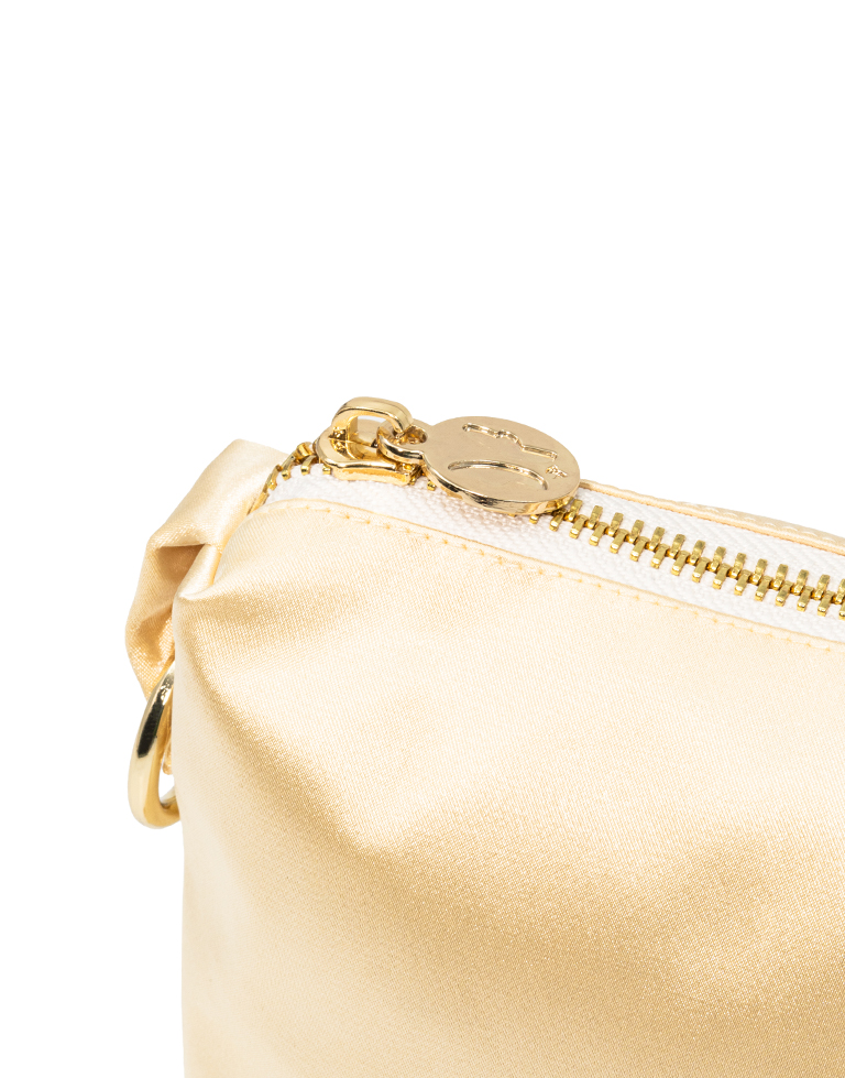 Necessaire em cetim de cor amarela com fecho dourado.