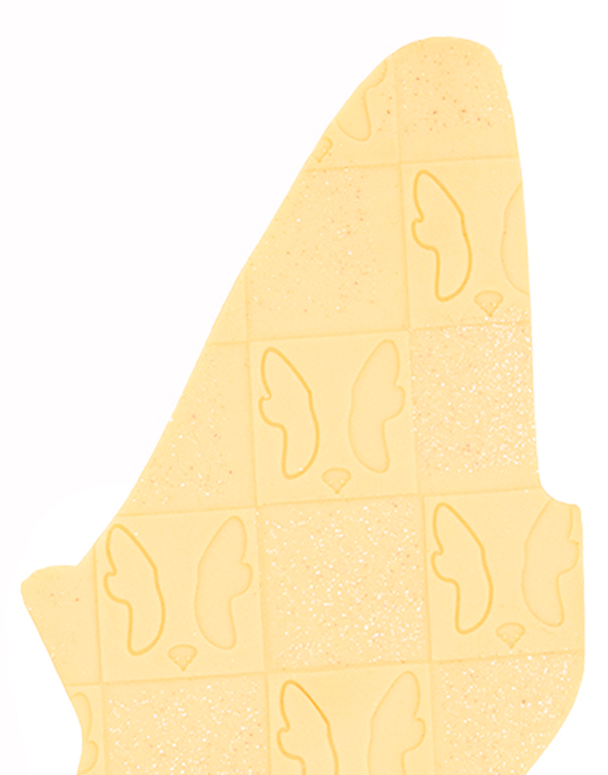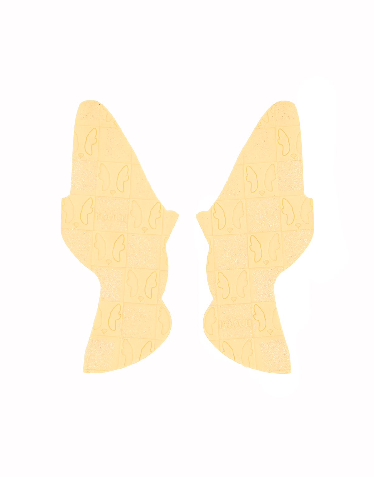Orelhas em TBAC (um composto de borracha) com estampado portrait amarelo com glitter.