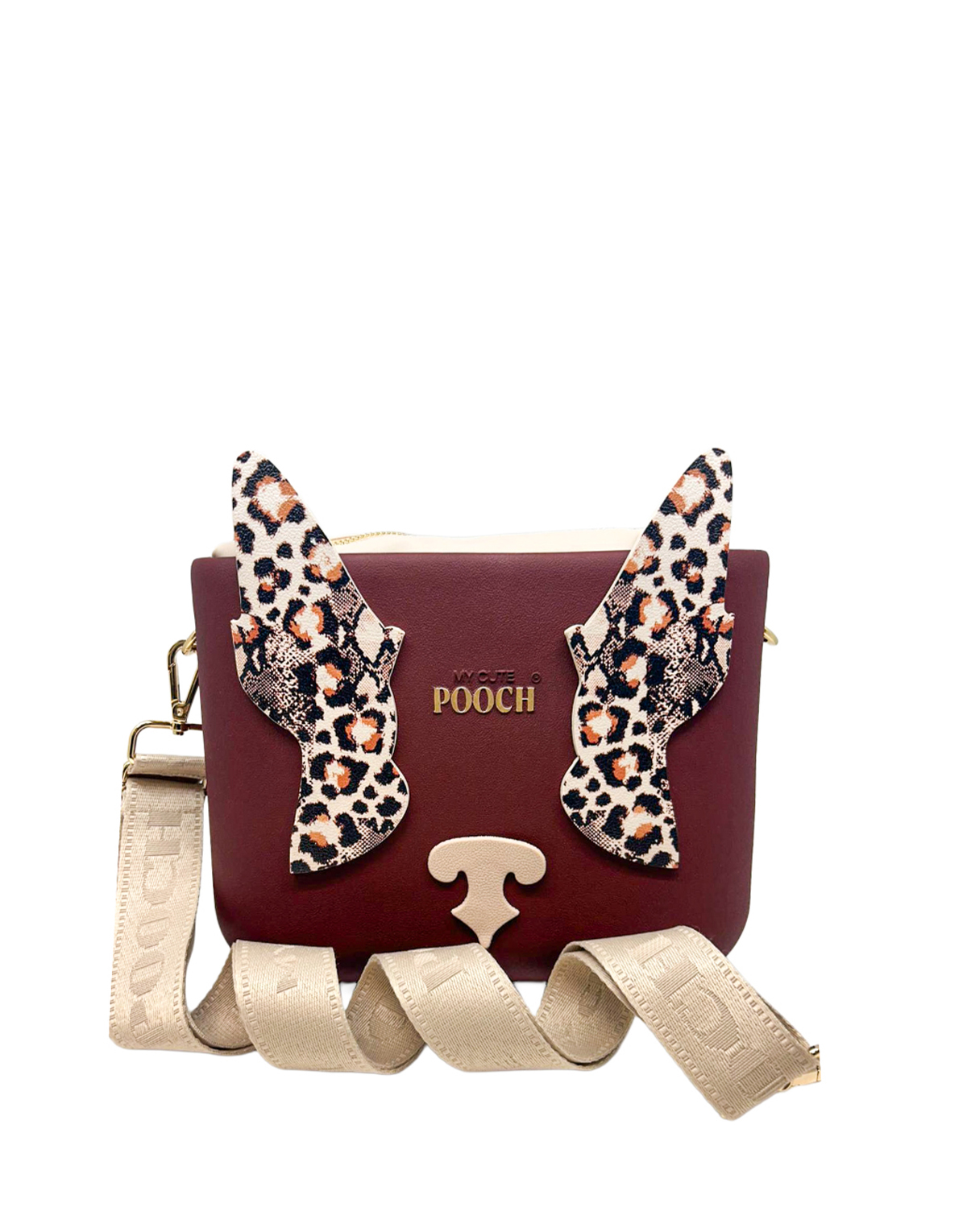 Pooch em B-Light® com letras em dourado (um composto de borracha perfumado) bordô com necessaire em lycra  cru com fecho dourado, orelha tigresse  , nariz nude inclui alça maria cru ajustável até 1.40. Tamanho da carteira mini-20cm x 15 cm x 7cm Tamanho da carteira maxi-27cm x 20,5 cm x 9cm