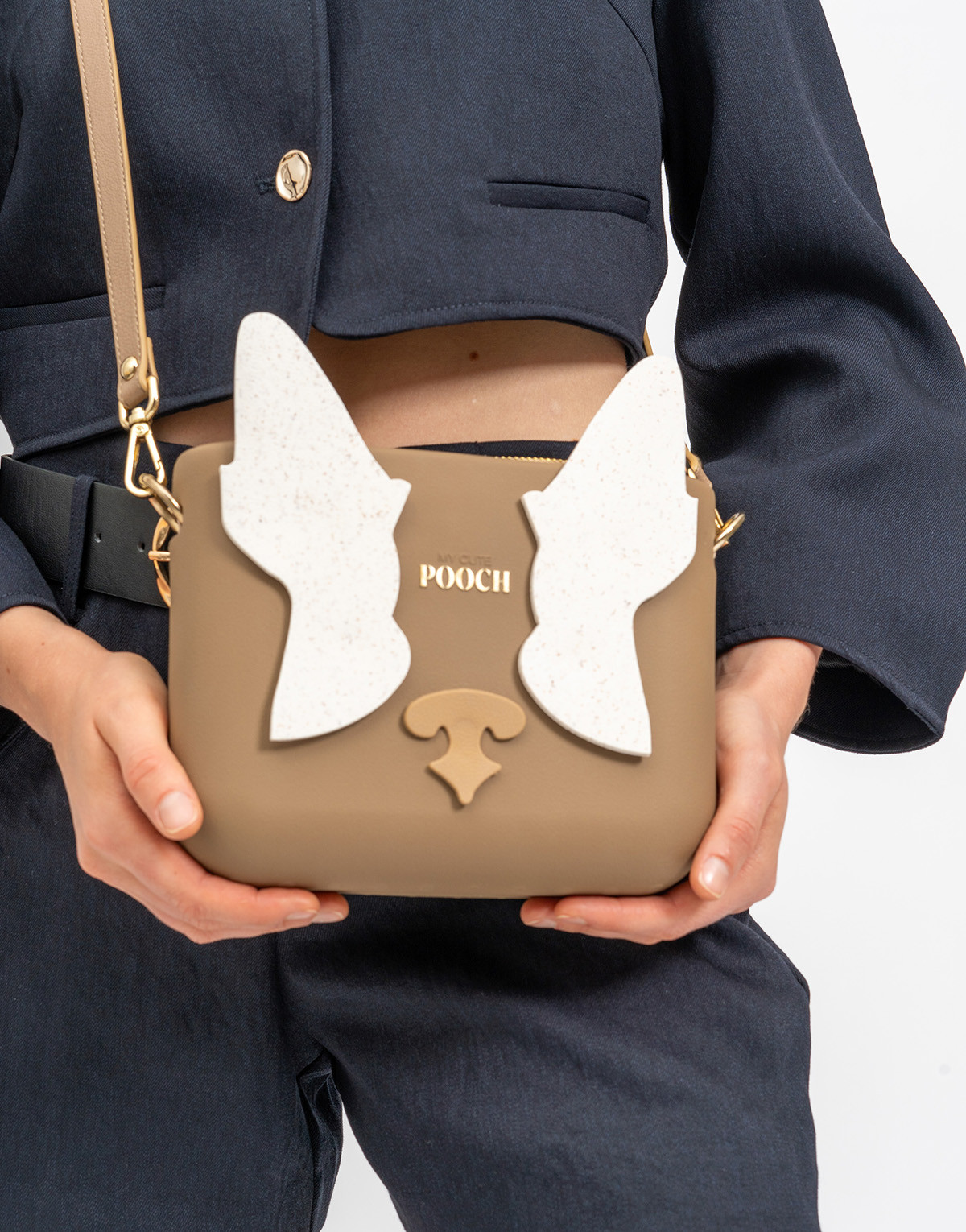 A POOCH é mais do que uma bolsa: é uma obra de arte 100% portuguesa, vegan, reciclável e muito duradoura. Personalizável para refletir quem tu és, transmite afeto e originalidade, adapta-se a todos os estilos e ocasiões e torna-se a companheira perfeita para cada momento da tua vida. | A Bronze é produzida em B-Light®, um composto nobre e exclusivo de borracha reciclável, ultraleve e perfumada. Com toque irresistivelmente suave na cor camel e letras pintadas à mão em dourado. O nécessaire tem bolsos internos é confeccionado em cetim camel, com fecho dourado personalizado com a marca POOCH. Como assinatura inconfundível da marca, a bolsa traz delicadas orelhinhas feitas com casca de arroz (I’m Corby and I know it), nariz na cor camel e com alça Glamour em pele sintética macia e regulável até 1,26 m, pensada para o teu conforto, na cor camel, tornando-a absolutamente encantadora.