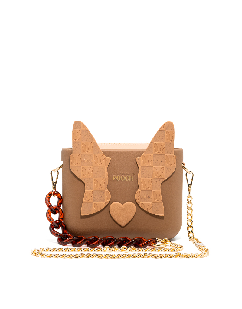 A POOCH é mais do que uma bolsa: é uma obra de arte 100% portuguesa, vegan, reciclável e muito duradoura. Personalizável para refletir quem tu és, transmite afeto e originalidade, adapta-se a todos os estilos e ocasiões e torna-se a companheira perfeita para cada momento da tua vida. A Pooch é produzida em B-Light®, um composto nobre e exclusivo de borracha reciclável e ultraleve. Com toque irresistivelmente suave na cor camel e letras pintadas à mão em dourado. O necessaire tem bolsos internos é confecionado em cetim camel, com fecho dourado personalizado com a marca POOCH. Como assinatura inconfundível da marca, a bolsa traz delicadas orelhinhas com um padrão self-portait camel decoradas com glitter, um nariz em formato de coração na cor camel e uma alça mix de osso tartuga com corrente agnes. A alça é regulável até 1,16 m.