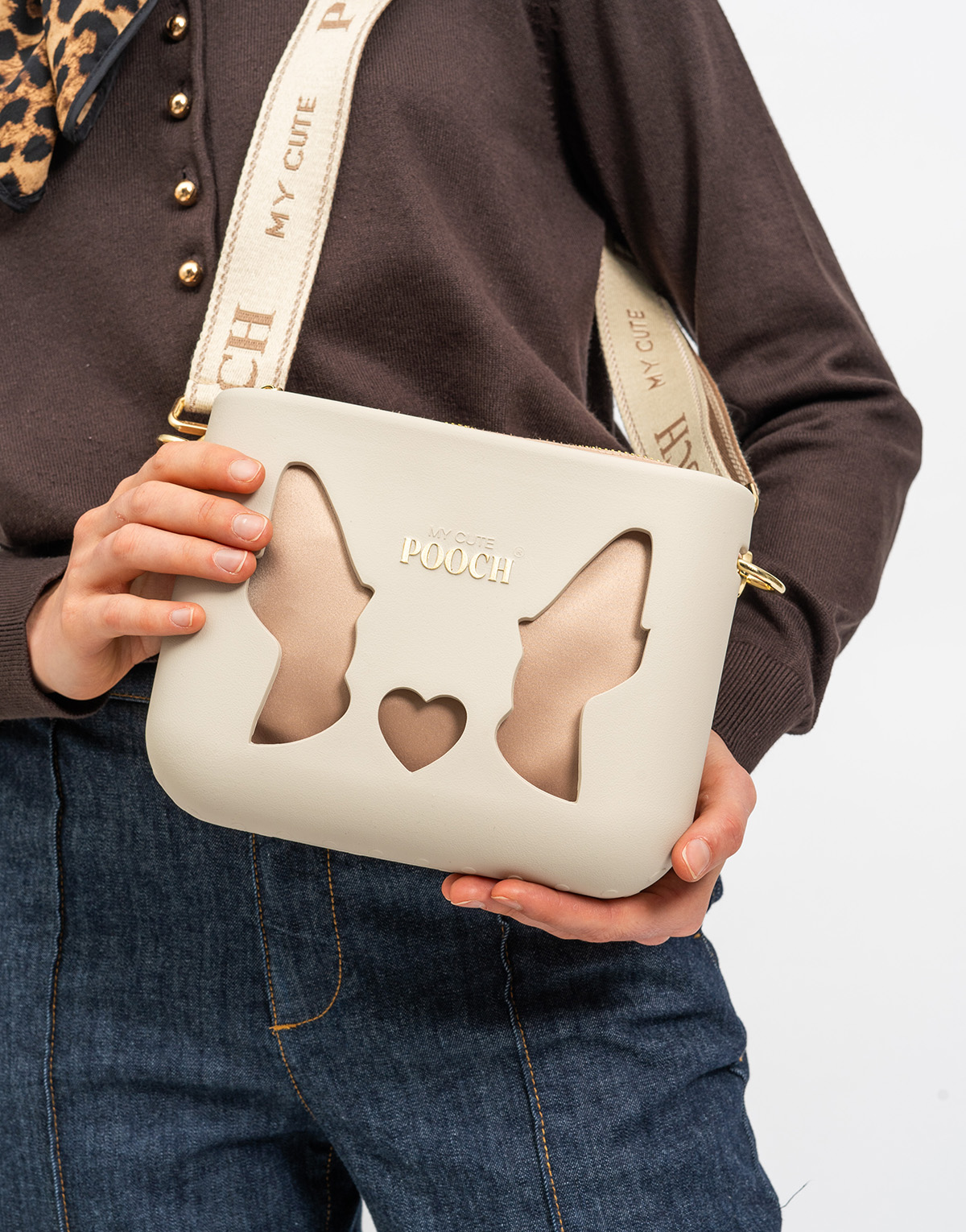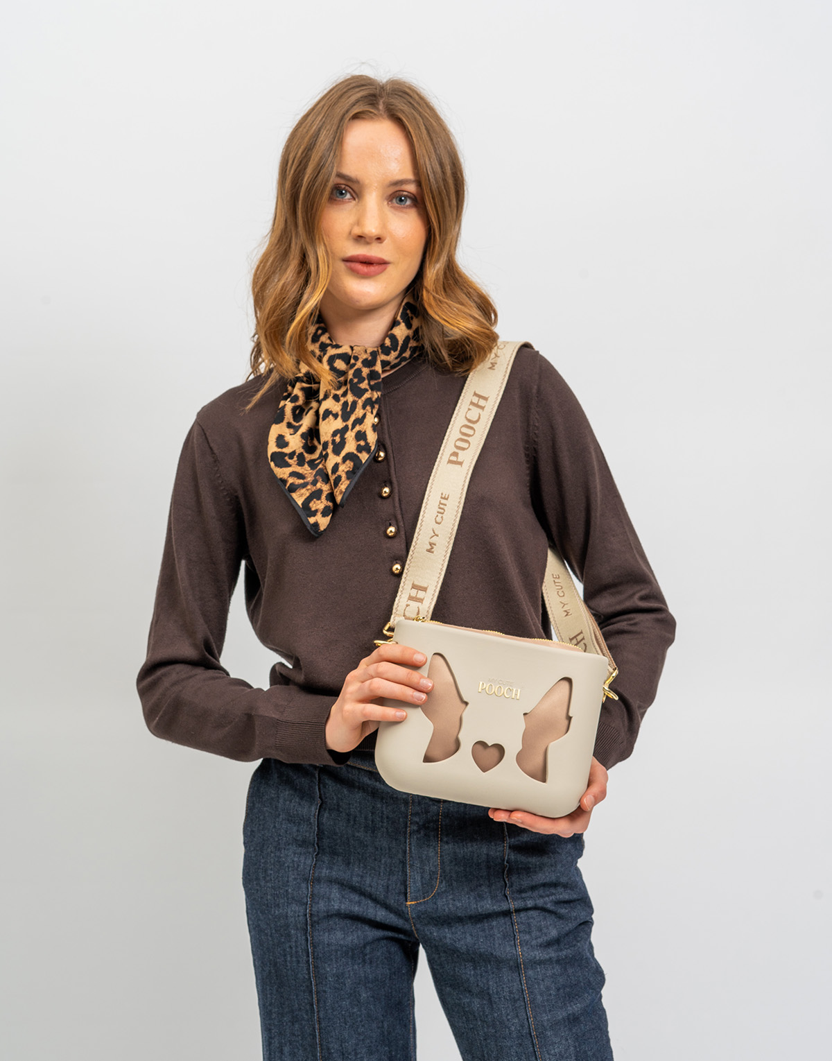 A POOCH é mais do que uma bolsa: é uma obra de arte 100% portuguesa, vegan e reciclável, feita para durar. Personalizável para refletir exatamente quem tu és, este modelo apresenta um recorte frontal em formato das icónicas orelhinhas Pooch e uma textura cuidadosamente trabalhada nos tecidos, que torna cada detalhe especial. Adapta-se a todos os estilos e ocasiões, tornando-se a companheira perfeita para os teus momentos diários. |A Cutout é produzida em B-Light®, um composto de borracha perfumado exclusivo e ultraleve, na elegante cor cru, com letras em dourado pintadas à mão. Com o toque distintivo que só a POOCH oferece, a bolsa apresenta o recorte frontal das icónicas orelhinhas e inclui um nécessaire cetim camel, com fecho dourado personalizado com a marca POOCH e uma alça Maria em jacquard na cor cru e camel em tecido macio e regulável até 1,40 m. Uma bolsa única que exala sofisticação e elegância discreta e conforto.