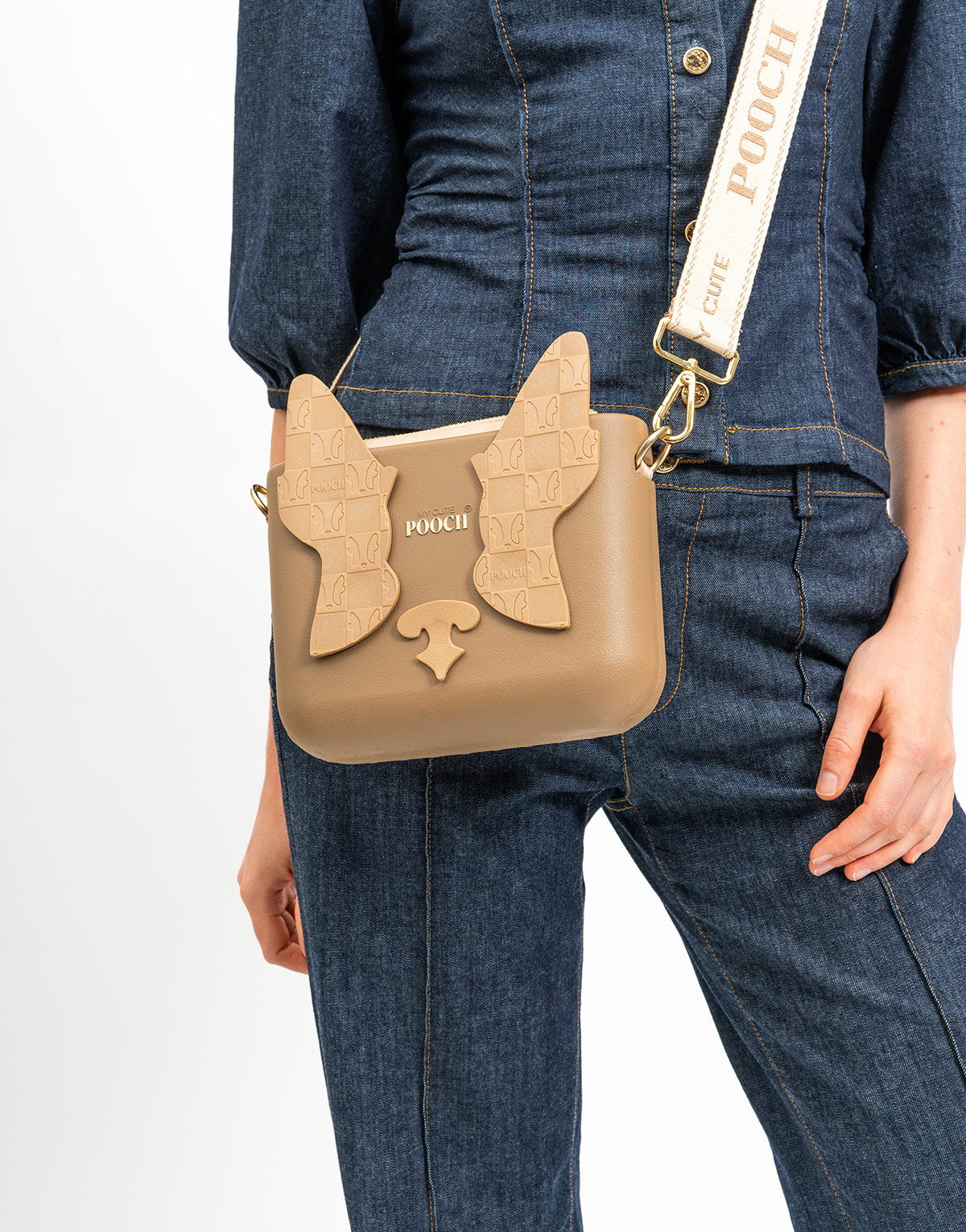 A POOCH é mais do que uma bolsa: é uma obra de arte 100% portuguesa, vegan, reciclável e muito duradoura. Personalizável para refletir quem tu és, transmite afeto e originalidade, adapta-se a todos os estilos e ocasiões e torna-se a companheira perfeita para cada momento da tua vida. | A Duna é produzida em B-Light®, um composto nobre e exclusivo de borracha reciclável, ultraleve e perfumada. Com toque irresistivelmente suave na cor camel e letras pintadas à mão em dourado. O nécessaire tem bolsos internos é confeccionado em cetim camel, com fecho dourado personalizado com a marca POOCH. Como assinatura inconfundível da marca, a bolsa traz delicadas orelhinhas Self-portait, com o padrão Pooch na cor camel e pequenas particulas de brilho, um nariz camel e alça Maria em jacquard regulável até 1,40 m, na cor camel e cru, tornando-a absolutamente encantadora.