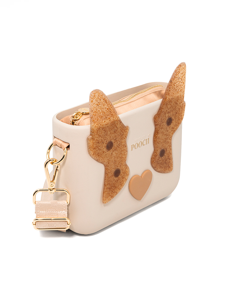 A POOCH é mais do que uma bolsa: é uma obra de arte 100% portuguesa, vegan, reciclável e muito duradoura. Personalizável para refletir quem tu és, transmite afeto e originalidade, adapta-se a todos os estilos e ocasiões e torna-se a companheira perfeita para cada momento da tua vida. A Pooch é produzida em B-Light®, um composto nobre e exclusivo de borracha reciclável e ultraleve. Com toque irresistivelmente suave na cor cru e letras pintadas à mão em dourado. O necessaire tem bolsos internos é confecionado em cetim camel, com fecho dourado personalizado com a marca POOCH. Como assinatura inconfundível da marca, a bolsa traz delicadas orelhinhas decoradas com palhinha (Golden soul), um nariz em formato na cor camel. A alça Maria cru em jacquard, regulável até 1,40m garante conforto e leveza no uso.
