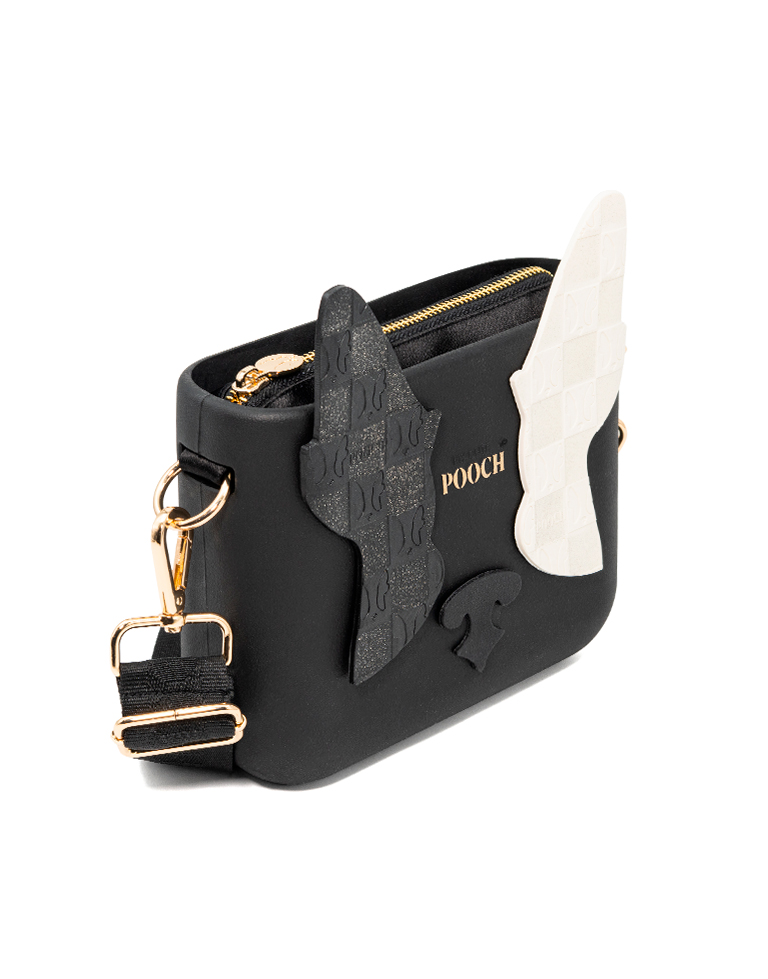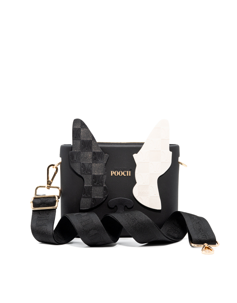 A POOCH é mais do que uma bolsa: é uma obra de arte 100% portuguesa, vegan, reciclável e muito duradoura. Personalizável para refletir quem tu és, transmite afeto e originalidade, adapta-se a todos os estilos e ocasiões e torna-se a companheira perfeita para cada momento da tua vida. A Pooch é produzida em B-Light®, um composto nobre e exclusivo de borracha reciclável e ultraleve. Com toque irresistivelmente suave na cor preta e letras pintadas à mão em dourado. O necessaire tem bolsos internos é confecionado em cetim preto, com fecho dourado personalizado com a marca POOCH. Como assinatura inconfundível da marca, a bolsa traz delicadas orelhinhas com um padrão self-portait branca e preta decoradas com glitter, um nariz na cor preto. A alça Maria preta em jacquard regulável até 1,40m, garante conforto e leveza no uso.