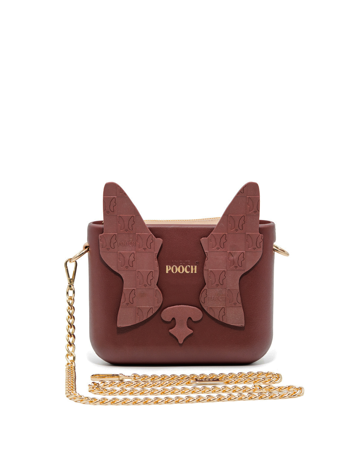 Pooch em B-Light® com letras em dourado (um composto de borracha perfumado) bordô com necessaire (lycra cru) com fecho dourado, orelha portrait bordô com glitter, nariz bordô inclui alça Agnes de 1.16. Tamanho da carteira mini-20cm x 15 cm x 7cm Tamanho da carteira maxi-27cm x 20,5 cm x 9cm.